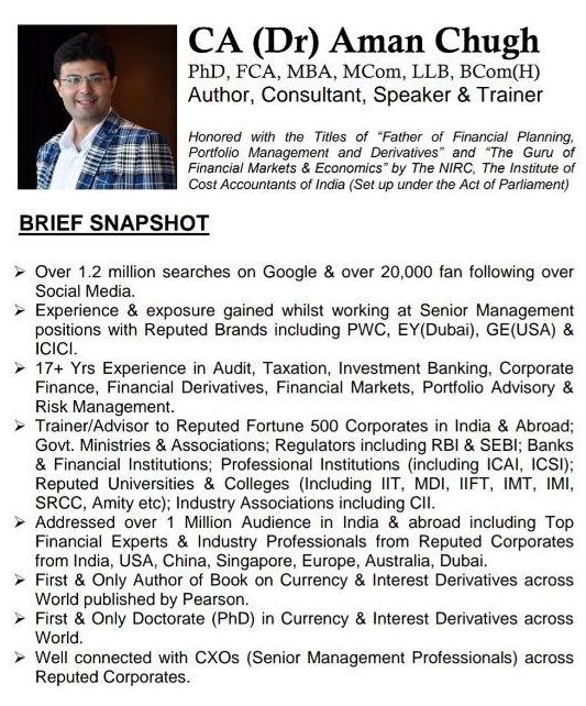 Hence for everyone it becomes very important to be competitive on knowledge by none other than CA (Dr) Aman Chugh (The man who predicted all such events and many more). He is rightly being honored with the title of “Father of Financial Planning, Portfolio Management, and Derivatives” & “Guru of Financial Markets and Economics”.